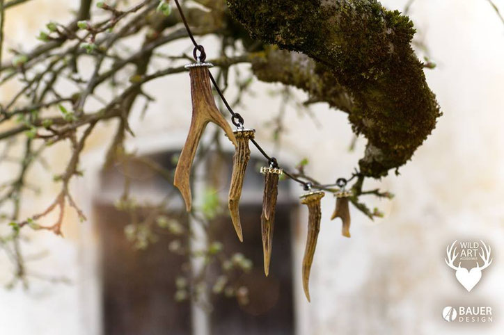 Die Anhänger werden aus Reh Geweihen hergestellt. Die Farbe der Geweihe variiert von Tier zu Tier und hängt davon ab, an welchem Baum die Tiere Ihr Geweih fegen.